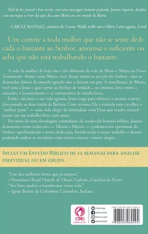 Um convite a toda mulher que não se sente dedicada o bastante ao Senhor, amorosa o suficiente ou acha que não está trabalhando o bastante. A vida da mulher de hoje não é tão diferente da vida de Maria e Marta no Novo Testamento. Assim como Maria, você deseja sentar-se aos pés do Senhor... mas as demandas diárias do mundo agitado não a deixam em paz. À semelhança de Marta, você ama a Jesus e quer servir ao Senhor de verdade... no entanto, luta contra a exaustão, o ressentimento e os sentimentos de insuficiência. Então, em meio a sua vida agitada, Jesus surge para oferecer o mesmo convite direcionado as duas irmãs de Betânia. Com ternura, Ele a convida para escolher a "melhor parte" — uma vida alegre de intimidade com Deus que resulta naturalmente em um trabalho feito com amor. Por meio de uma abordagem estimulante da conhecida história bíblica, Joanna demonstra como todas nós — Marias e Martas — podemos nos aproximar do Senhor: aprofundando a nossa dedicação, fortalecendo o nosso trabalho e desempenhando ambas as atividades com menos estresse e maior alegria.