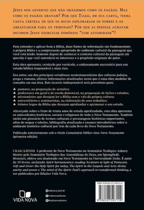 Jesus nos advertiu que não orássemos como os pagãos. Mas como os pagãos oravam? Por que Tiago, em sua carta, tinha tanta certeza de que os ricos explorariam os pobres os pobres e os arrastariam para os tribunais? Por que as pessoas achavam incomum Jesus exorcizar demônios "com autoridade"? Para entender e aplicar bem a Bíblia, duas fontes de informação são fundamentais: a própria Bíblia e a compreensão apropriada do ambiente cultural da passagem que você está lendo. Somente depois de conhecer o contexto cultural da passagem em questão é que você entenderá os interesses e o propósito originais do autor. Esta obra apresenta, versículo por versículo, o embasamento necessário para um estudo bíblico responsável e mais rico. Seu autor, um dos principais estudiosos neotestamentários das culturas judaica, grega e romana, oferece informações atualizadas nesta que é uma obra modelar de consulta em sua área. Este recurso indispensável será proveitoso para: - pastores, na preparação de sermões; - professores em geral e de escola dominical, na preparação de lições e estudos; - missionários que desejam ler a Bíblia sem o viés da própria cultura; - universitários e seminaristas, na elaboração de seus trabalhos; - leitores leigos da Bíblia que desejam aprofundar e aprimorar o seu estudo. Alicerçado sobre o fruto de trinta anos de estudo aprofundado, esta obra apresenta os antecedentes históricos, sociais e religiosos de todo o Novo Testamento. Também inclui um glossário de termos culturais e personagens históricas importantes, além de mapas e tabelas, bibliografia atualizada e ensaios introdutórios sobre o ambiente histórico-cultural por trás de cada livro do Novo Testamento.